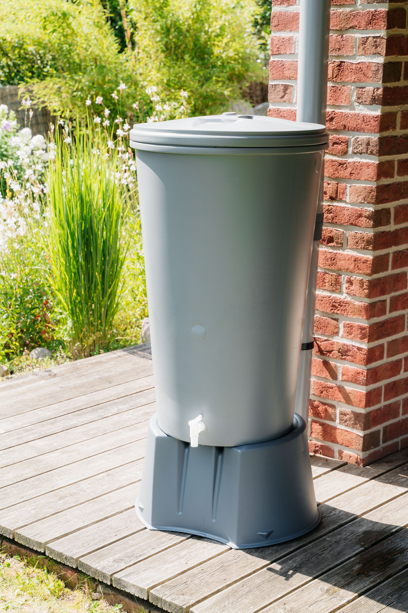 Die Regentonne besteht aus sortenreinem, recyclingfähigem Polyethylen und ist vollständig frei von PVC oder Weichmachern. Sie unterstützt ein nachhaltiges Wassermanagement – ressourcenschonend, langlebig und robust.